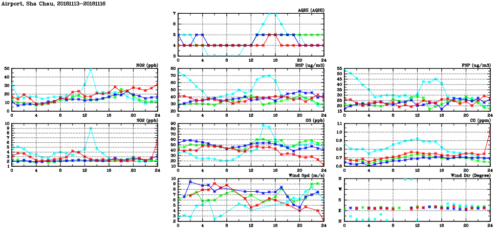 | Air Quality Data Time Series in Airport, Sha Chau (2018/11/16) | ( Line colors: Day -3 Day -2 Day -1 Current day ) | 2D Map Current AQHI |