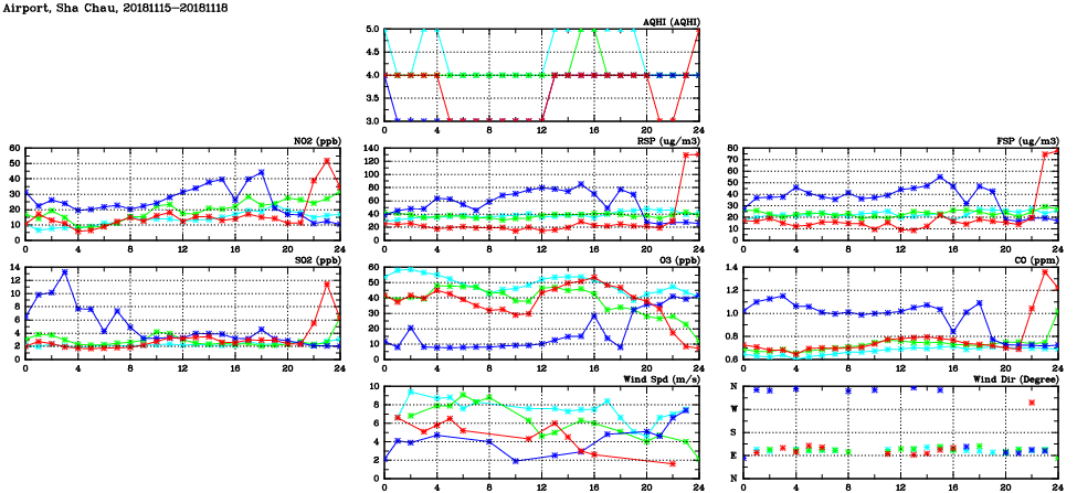 | Air Quality Data Time Series in Airport, Sha Chau (2018/11/18) | ( Line colors: Day -3 Day -2 Day -1 Current day ) | 2D Map Current AQHI |