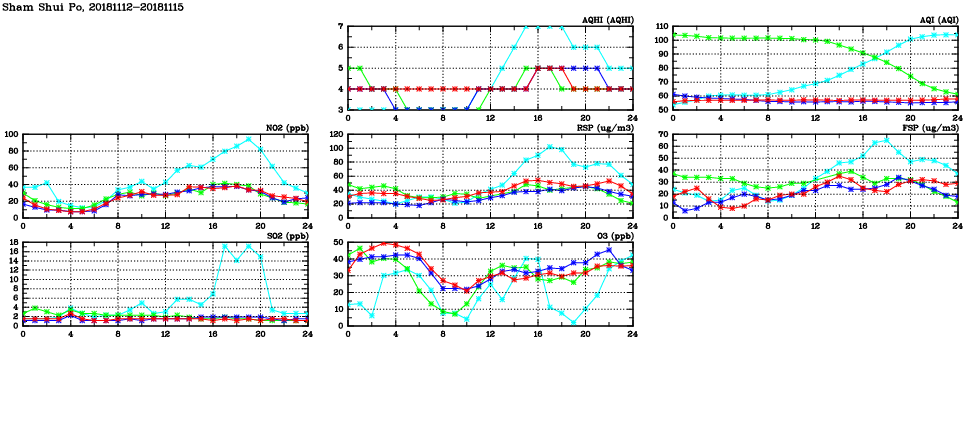| Air Quality Data Time Series in Sham Shui Po (2018/11/15) | ( Line colors: Day -3 Day -2 Day -1 Current day ) | 2D Map Current AQHI |