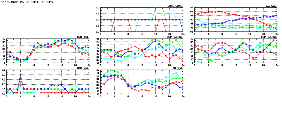 | Air Quality Data Time Series in Sham Shui Po (2018/11/17) | ( Line colors: Day -3 Day -2 Day -1 Current day ) | 2D Map Current AQHI |