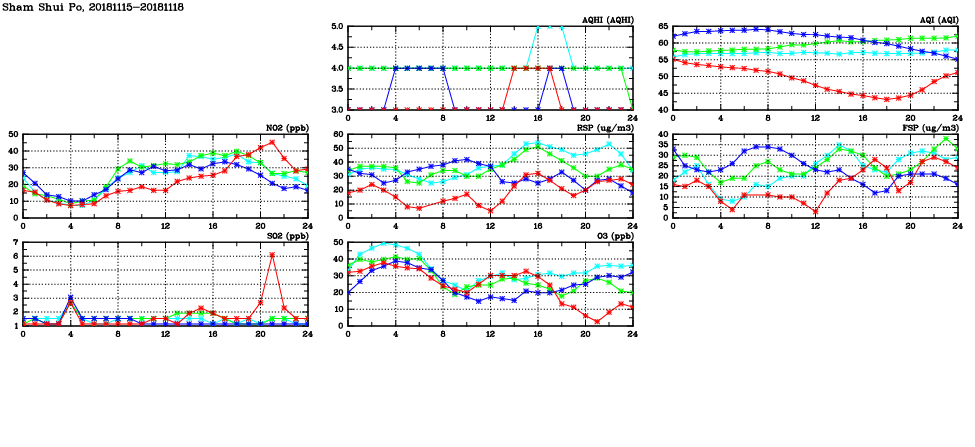 | Air Quality Data Time Series in Sham Shui Po (2018/11/18) | ( Line colors: Day -3 Day -2 Day -1 Current day ) | 2D Map Current AQHI |