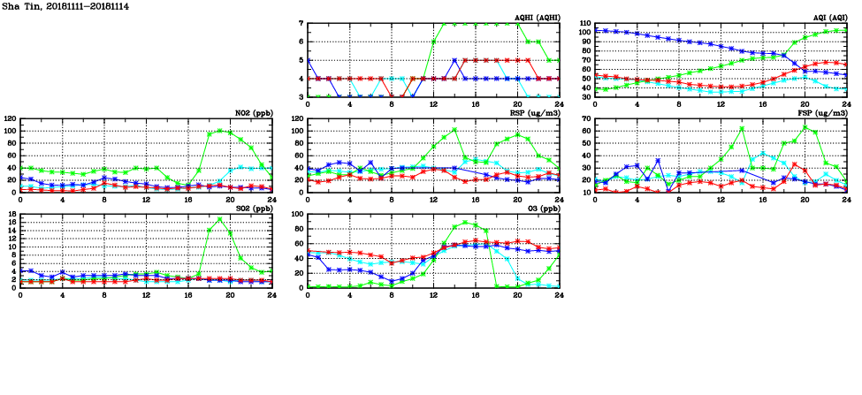 | Air Quality Data Time Series in Sha Tin (2018/11/14) | ( Line colors: Day -3 Day -2 Day -1 Current day ) | 2D Map Current AQHI |