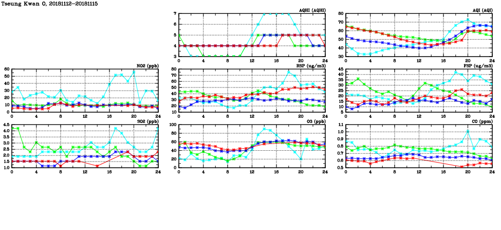 | Air Quality Data Time Series in Tseung Kwan O (2018/11/15) | ( Line colors: Day -3 Day -2 Day -1 Current day ) | 2D Map Current AQHI |