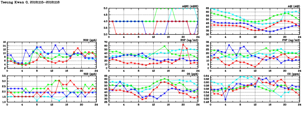 | Air Quality Data Time Series in Tseung Kwan O (2018/11/18) | ( Line colors: Day -3 Day -2 Day -1 Current day ) | 2D Map Current AQHI |
