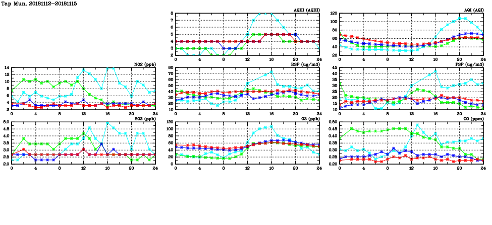 | Air Quality Data Time Series in Tap Mun (2018/11/15) | ( Line colors: Day -3 Day -2 Day -1 Current day ) | 2D Map Current AQHI |