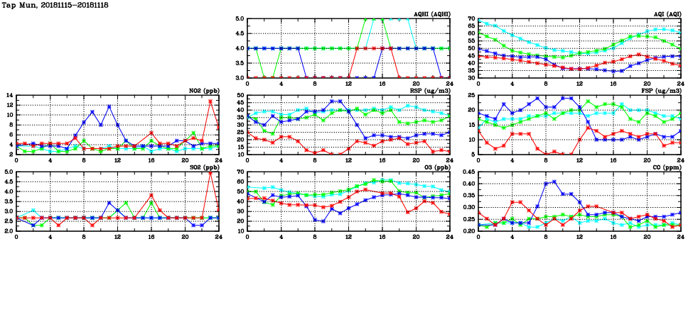 | Air Quality Data Time Series in Tap Mun (2018/11/18) | ( Line colors: Day -3 Day -2 Day -1 Current day ) | 2D Map Current AQHI |