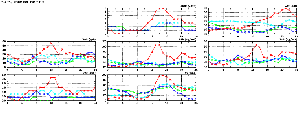 | Air Quality Data Time Series in Tai Po (2018/11/12) | ( Line colors: Day -3 Day -2 Day -1 Current day ) | 2D Map Current AQHI |