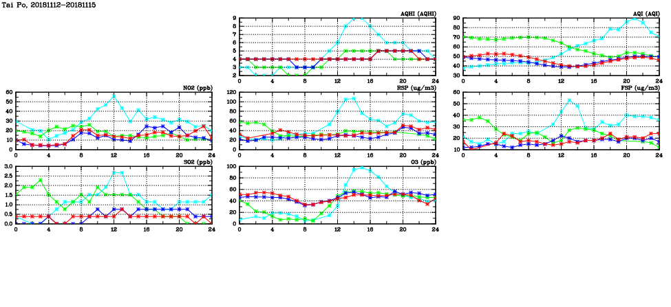 | Air Quality Data Time Series in Tai Po (2018/11/15) | ( Line colors: Day -3 Day -2 Day -1 Current day ) | 2D Map Current AQHI |