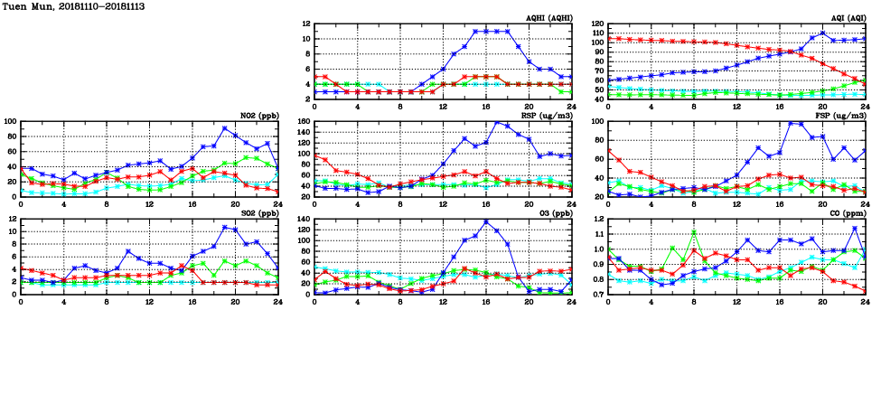 | Air Quality Data Time Series in Tuen Mun (2018/11/13) | ( Line colors: Day -3 Day -2 Day -1 Current day ) | 2D Map Current AQHI |