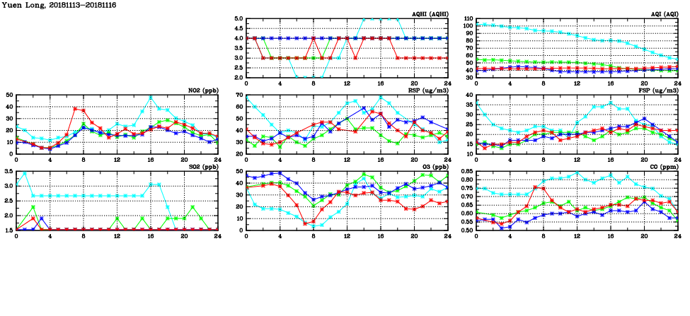 | Air Quality Data Time Series in Yuen Long (2018/11/16) | ( Line colors: Day -3 Day -2 Day -1 Current day ) | 2D Map Current AQHI |