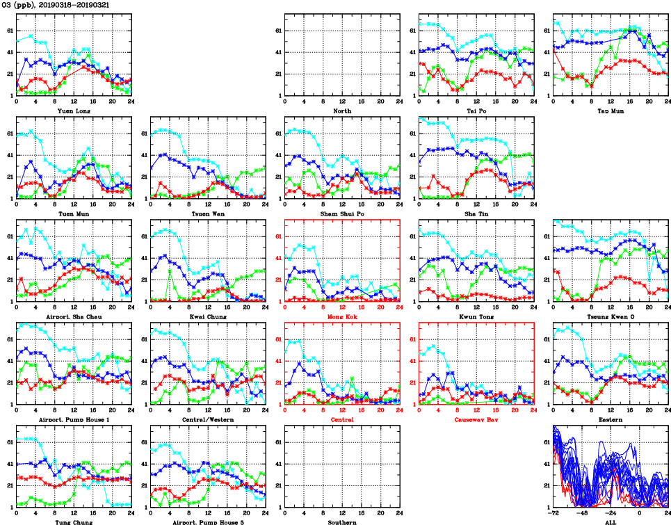 | Air Quality Data Time Series for O3 (2019/03/21) | ( Line colors: Day -3 Day -2 Day -1 Current day ) | 2D Map Current AQHI |