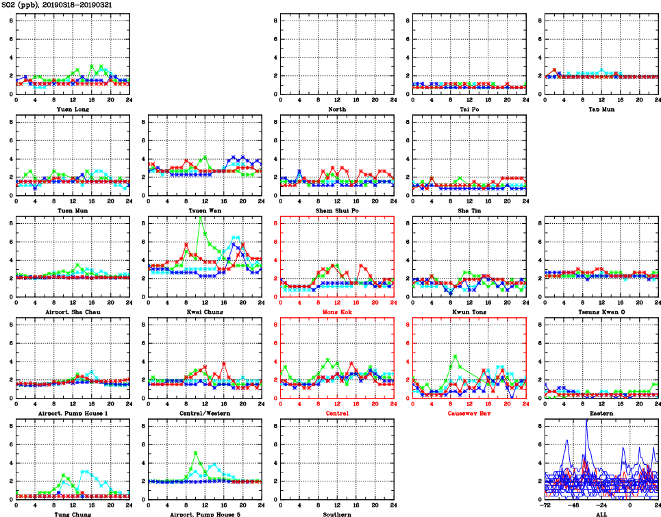 | Air Quality Data Time Series for SO2 (2019/03/21) | ( Line colors: Day -3 Day -2 Day -1 Current day ) | 2D Map Current AQHI |