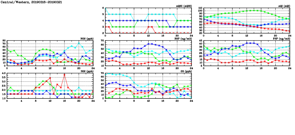 | Air Quality Data Time Series in Central/Western (2019/03/21) | ( Line colors: Day -3 Day -2 Day -1 Current day ) | 2D Map Current AQHI |