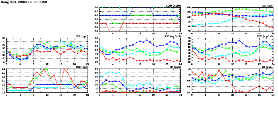 | Air Quality Data Time Series in Mong Kok (2019/03/21) | ( Line colors: Day -3 Day -2 Day -1 Current day ) | 2D Map Current AQHI |