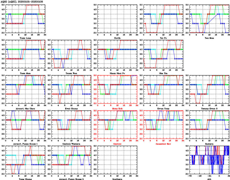 | Air Quality Data Time Series for AQHI (2020/01/08) | ( Line colors: Day -3 Day -2 Day -1 Current day ) | 2D Map Current AQHI |