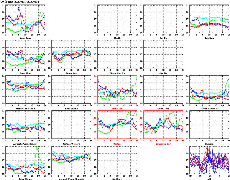| Air Quality Data Time Series for CO (2020/01/04) | ( Line colors: Day -3 Day -2 Day -1 Current day ) | 2D Map Current AQHI |