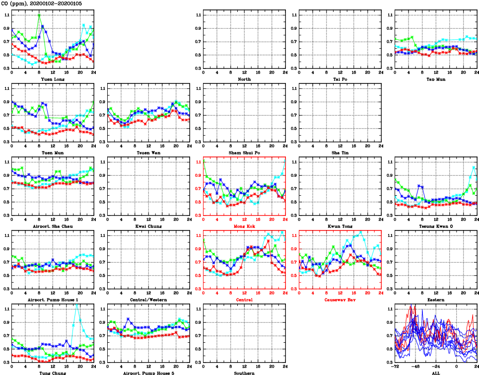 | Air Quality Data Time Series for CO (2020/01/05) | ( Line colors: Day -3 Day -2 Day -1 Current day ) | 2D Map Current AQHI |