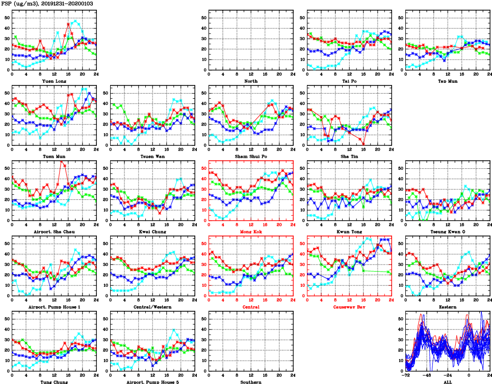 | Air Quality Data Time Series for FSP (2020/01/03) | ( Line colors: Day -3 Day -2 Day -1 Current day ) | 2D Map Current AQHI |