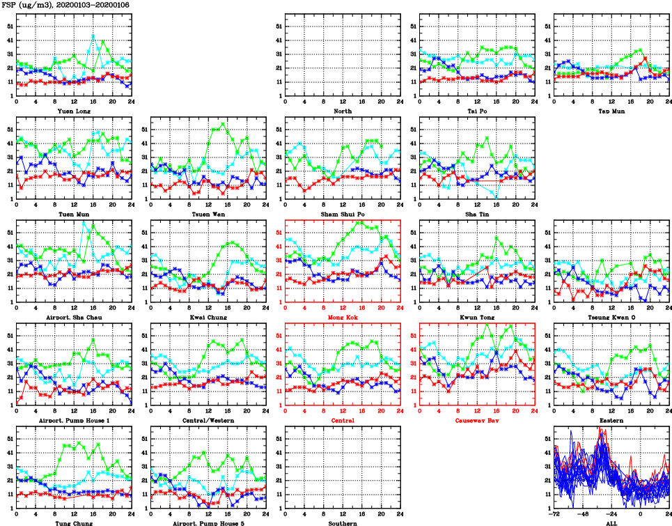 | Air Quality Data Time Series for FSP (2020/01/06) | ( Line colors: Day -3 Day -2 Day -1 Current day ) | 2D Map Current AQHI |