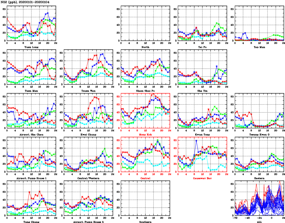 | Air Quality Data Time Series for NO2 (2020/01/04) | ( Line colors: Day -3 Day -2 Day -1 Current day ) | 2D Map Current AQHI |