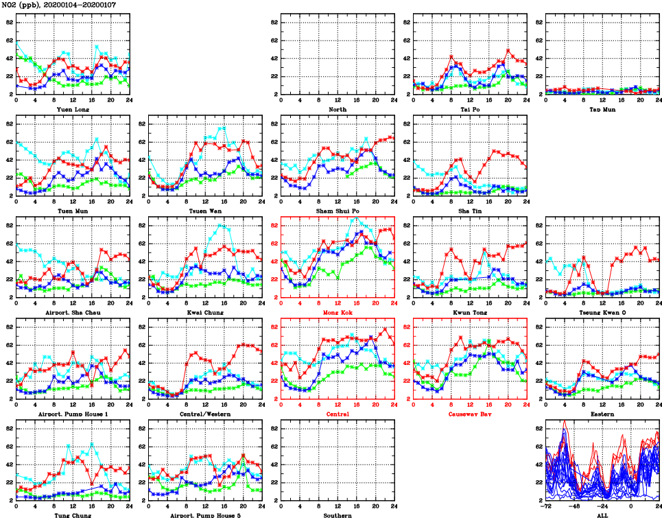 | Air Quality Data Time Series for NO2 (2020/01/07) | ( Line colors: Day -3 Day -2 Day -1 Current day ) | 2D Map Current AQHI |