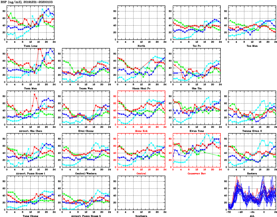 | Air Quality Data Time Series for RSP (2020/01/03) | ( Line colors: Day -3 Day -2 Day -1 Current day ) | 2D Map Current AQHI |
