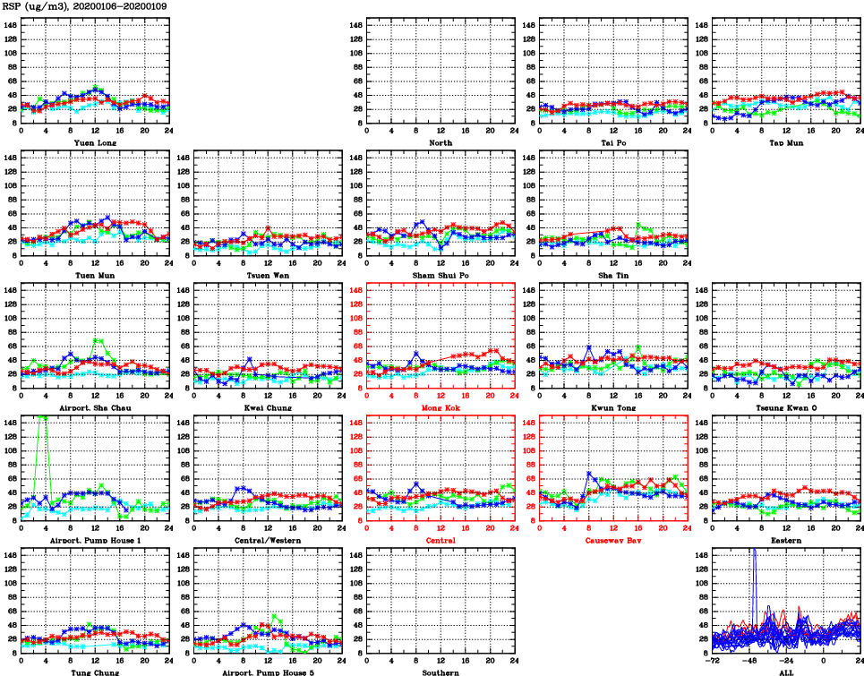| Air Quality Data Time Series for RSP (2020/01/09) | ( Line colors: Day -3 Day -2 Day -1 Current day ) | 2D Map Current AQHI |