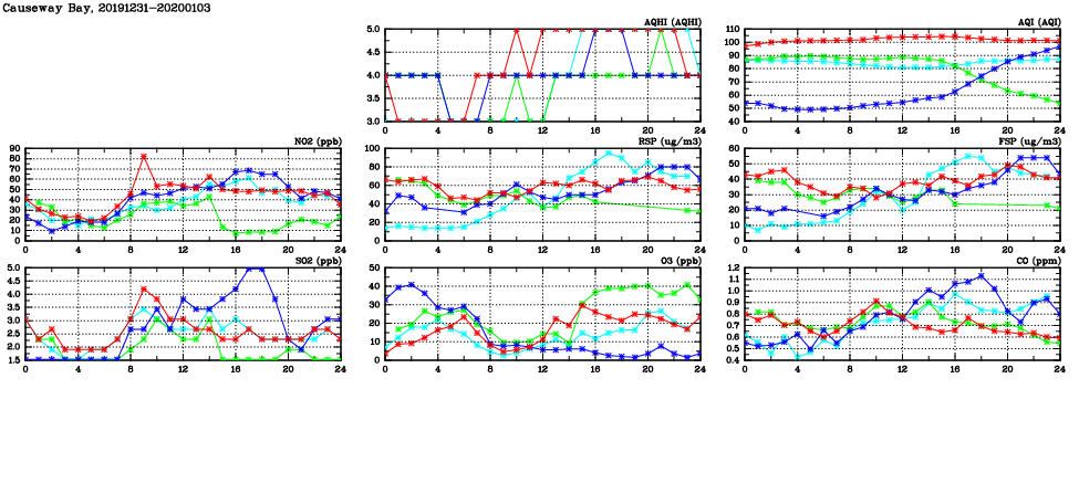 | Air Quality Data Time Series in Causeway Bay (2020/01/03) | ( Line colors: Day -3 Day -2 Day -1 Current day ) | 2D Map Current AQHI |