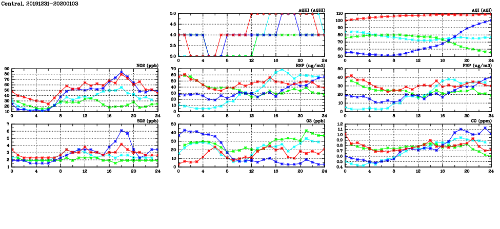 | Air Quality Data Time Series in Central (2020/01/03) | ( Line colors: Day -3 Day -2 Day -1 Current day ) | 2D Map Current AQHI |