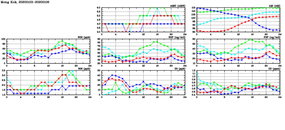 | Air Quality Data Time Series in Mong Kok (2020/01/06) | ( Line colors: Day -3 Day -2 Day -1 Current day ) | 2D Map Current AQHI |