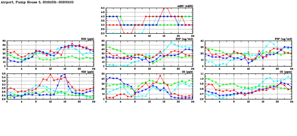 | Air Quality Data Time Series in Airport, Pump House 5 (2020/01/03) | ( Line colors: Day -3 Day -2 Day -1 Current day ) | 2D Map Current AQHI |