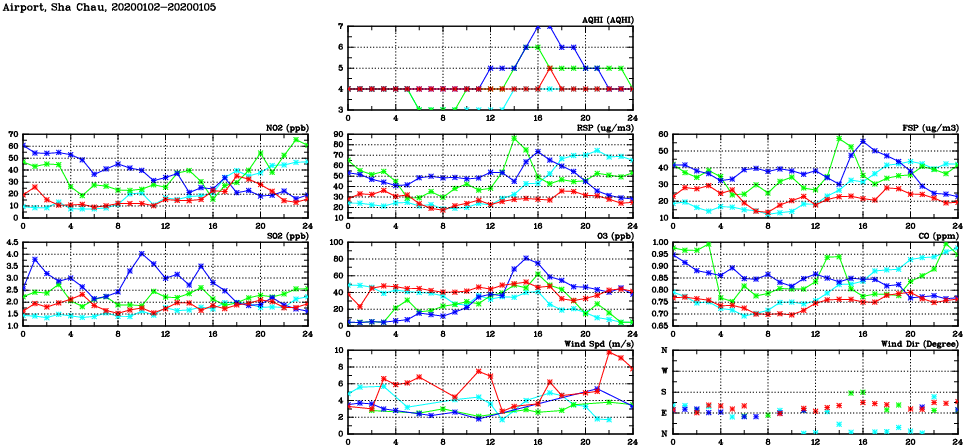 | Air Quality Data Time Series in Airport, Sha Chau (2020/01/05) | ( Line colors: Day -3 Day -2 Day -1 Current day ) | 2D Map Current AQHI |