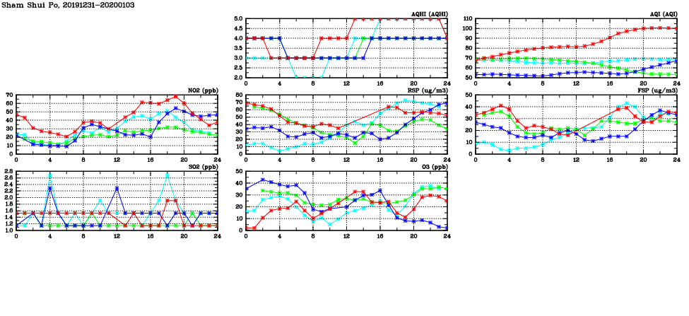 | Air Quality Data Time Series in Sham Shui Po (2020/01/03) | ( Line colors: Day -3 Day -2 Day -1 Current day ) | 2D Map Current AQHI |