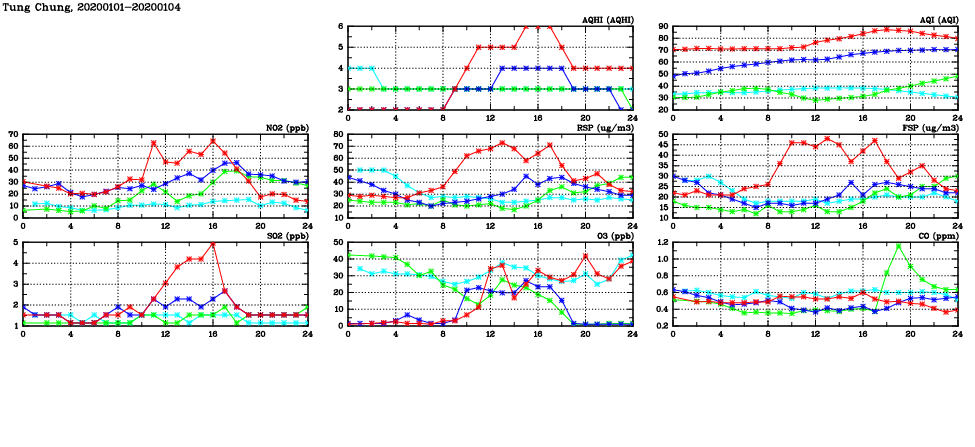 | Air Quality Data Time Series in Tung Chung (2020/01/04) | ( Line colors: Day -3 Day -2 Day -1 Current day ) | 2D Map Current AQHI |