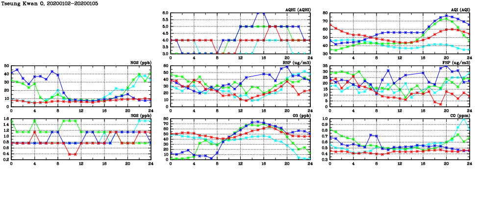 | Air Quality Data Time Series in Tseung Kwan O (2020/01/05) | ( Line colors: Day -3 Day -2 Day -1 Current day ) | 2D Map Current AQHI |