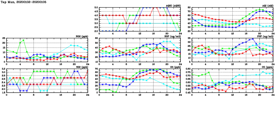 | Air Quality Data Time Series in Tap Mun (2020/01/05) | ( Line colors: Day -3 Day -2 Day -1 Current day ) | 2D Map Current AQHI |