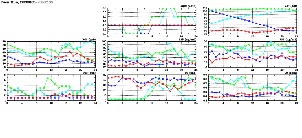 | Air Quality Data Time Series in Tuen Mun (2020/01/06) | ( Line colors: Day -3 Day -2 Day -1 Current day ) | 2D Map Current AQHI |