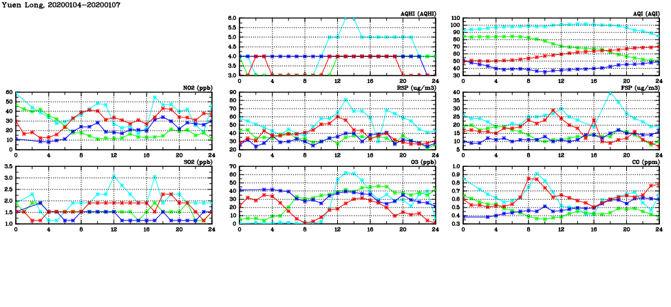| Air Quality Data Time Series in Yuen Long (2020/01/07) | ( Line colors: Day -3 Day -2 Day -1 Current day ) | 2D Map Current AQHI |