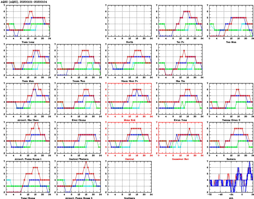 | Air Quality Data Time Series for AQHI (2020/01/04) | ( Line colors: Day -3 Day -2 Day -1 Current day ) | 2D Map Current AQHI |