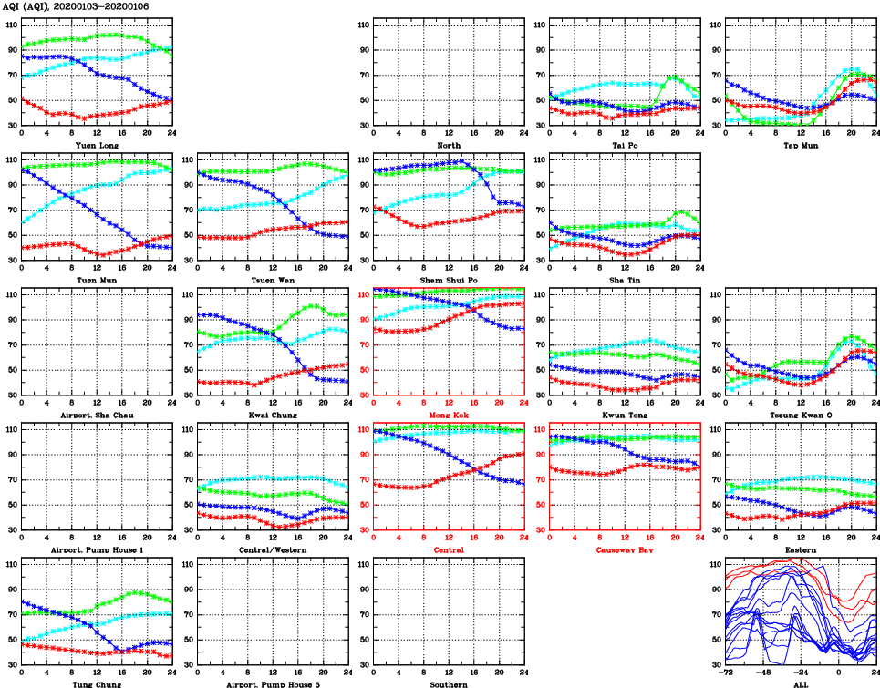 | Air Quality Data Time Series for AQI (2020/01/06) | ( Line colors: Day -3 Day -2 Day -1 Current day ) | 2D Map Current AQHI |