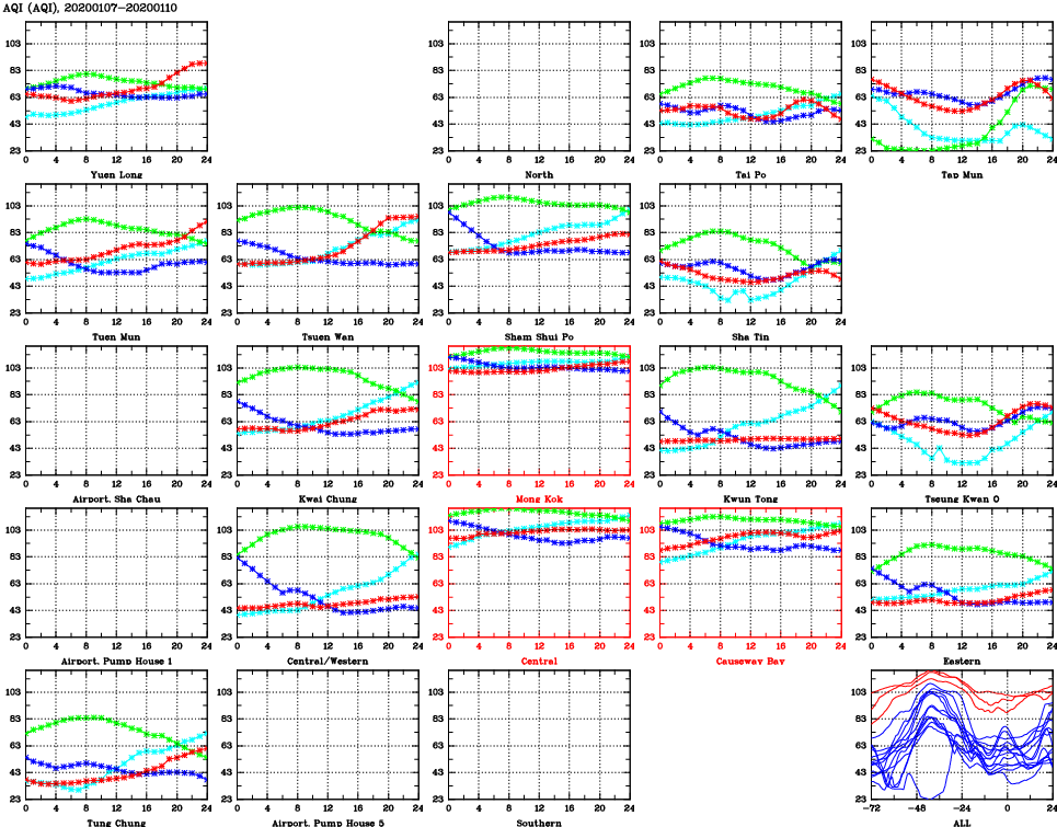 | Air Quality Data Time Series for AQI (2020/01/10) | ( Line colors: Day -3 Day -2 Day -1 Current day ) | 2D Map Current AQHI |