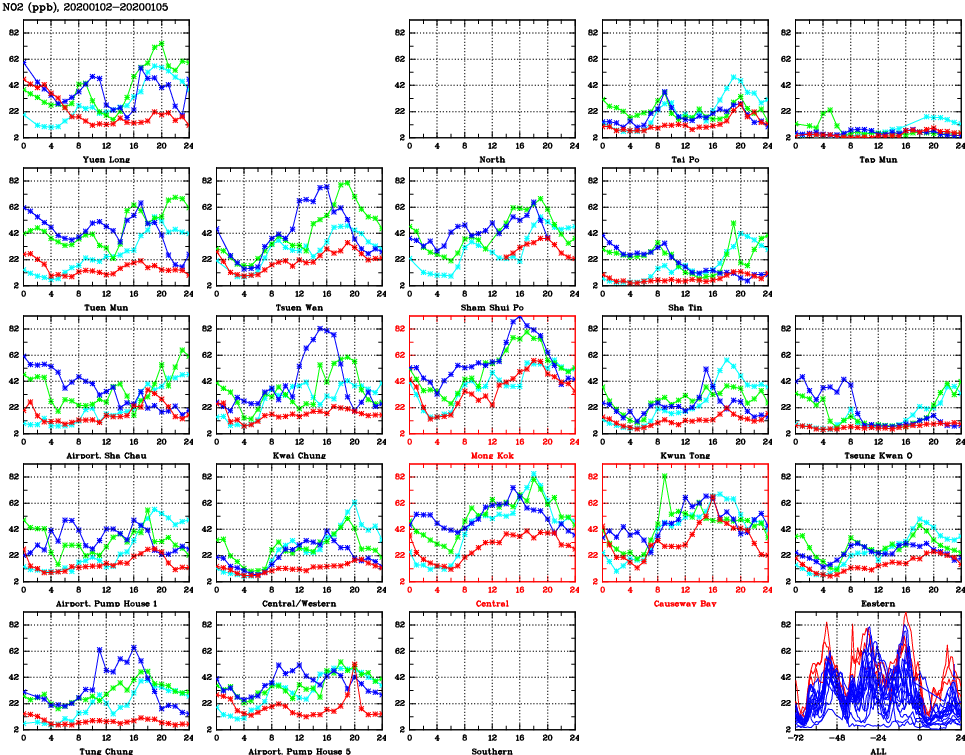 | Air Quality Data Time Series for NO2 (2020/01/05) | ( Line colors: Day -3 Day -2 Day -1 Current day ) | 2D Map Current AQHI |