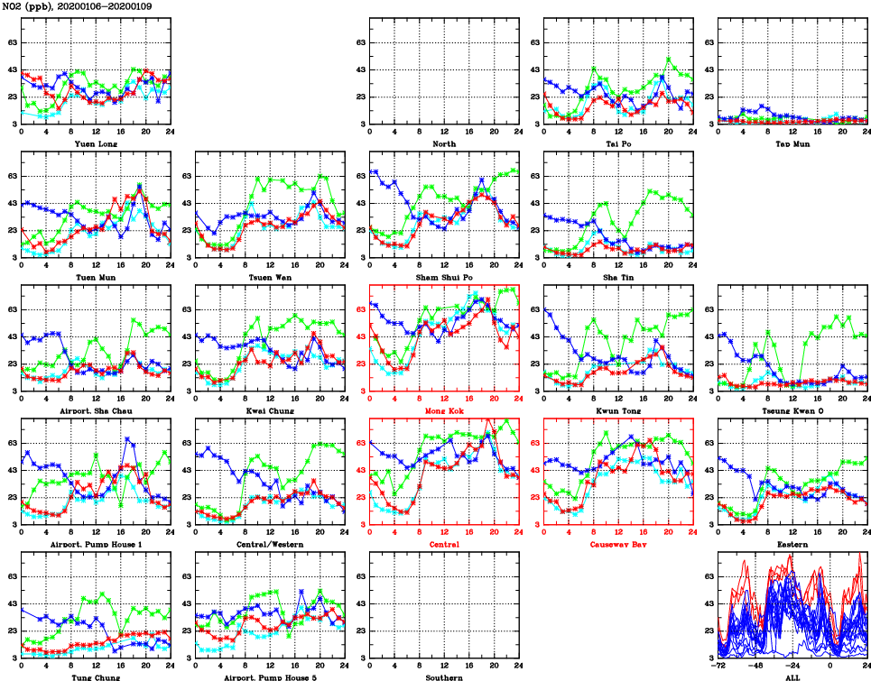 | Air Quality Data Time Series for NO2 (2020/01/09) | ( Line colors: Day -3 Day -2 Day -1 Current day ) | 2D Map Current AQHI |
