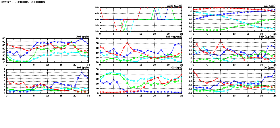 | Air Quality Data Time Series in Central (2020/01/08) | ( Line colors: Day -3 Day -2 Day -1 Current day ) | 2D Map Current AQHI |