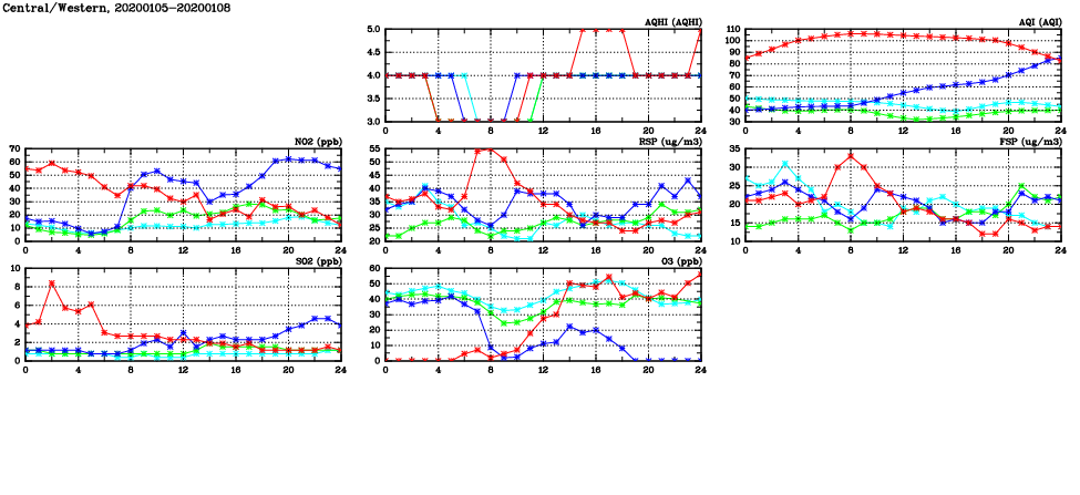| Air Quality Data Time Series in Central/Western (2020/01/08) | ( Line colors: Day -3 Day -2 Day -1 Current day ) | 2D Map Current AQHI |
