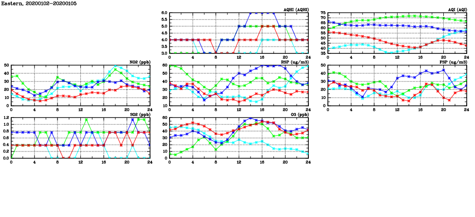 | Air Quality Data Time Series in Eastern (2020/01/05) | ( Line colors: Day -3 Day -2 Day -1 Current day ) | 2D Map Current AQHI |