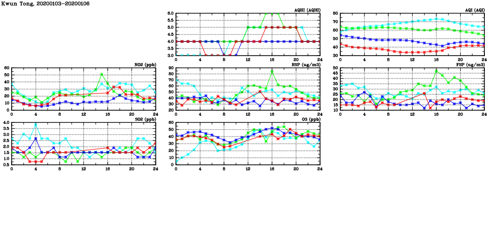 | Air Quality Data Time Series in Kwun Tong (2020/01/06) | ( Line colors: Day -3 Day -2 Day -1 Current day ) | 2D Map Current AQHI |
