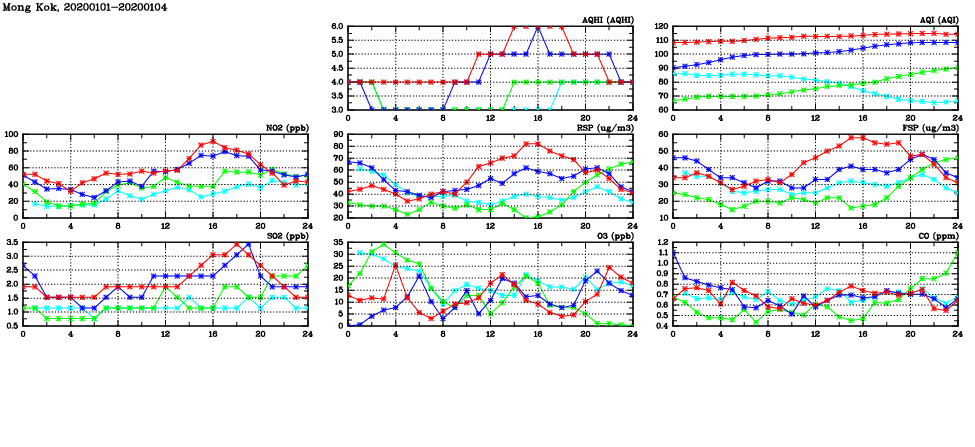| Air Quality Data Time Series in Mong Kok (2020/01/04) | ( Line colors: Day -3 Day -2 Day -1 Current day ) | 2D Map Current AQHI |