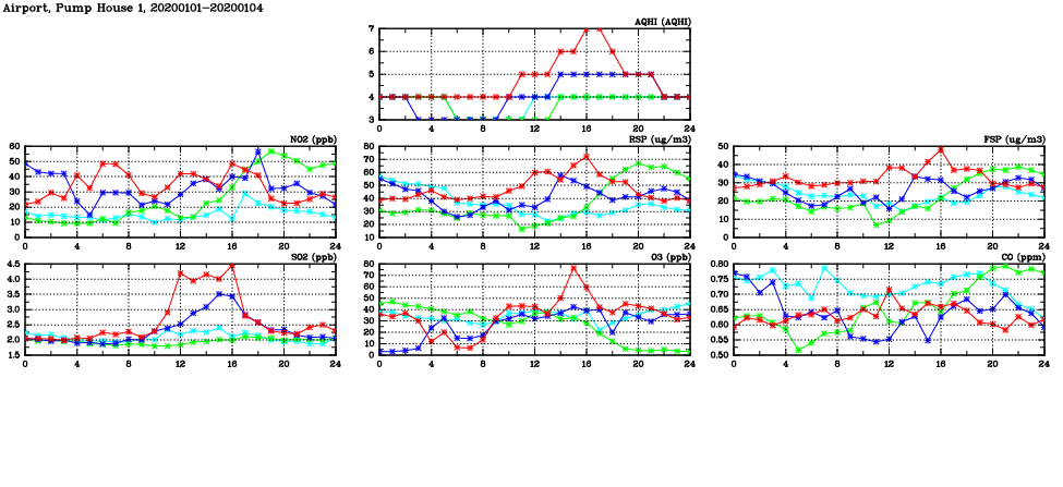 Air Quality Data Time Series in Airport, Pump House 1 (2020/01/04) | ( Line colors: Day -3 Day -2 Day -1 Current day ) | 2D Map Current AQHI |