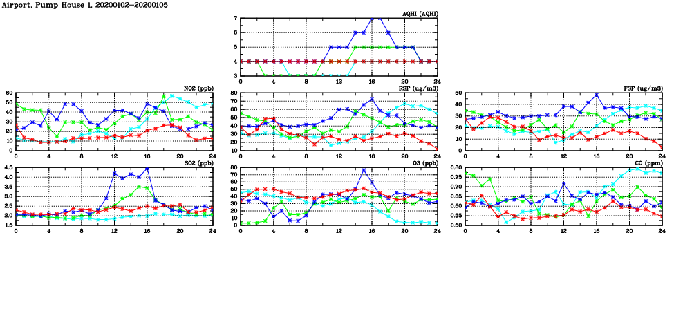| Air Quality Data Time Series in Airport, Pump House 1 (2020/01/05) | ( Line colors: Day -3 Day -2 Day -1 Current day ) | 2D Map Current AQHI |